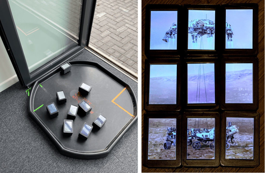 MOSAIX has been used as a “moving puzzle” to educate school children on robotics. Each of the Tiles showed a part of an image while moving randomly in an arena. The child’s task was to figure out how to stop them (by touching the screen) and to assemble them. When correctly assembled, the Tiles would show an image of the Mars Perseverance (credit: NASA/JPL-Caltech). This opened the door for us to talk to the children about swarm robotics, space robotics and STEM careers.